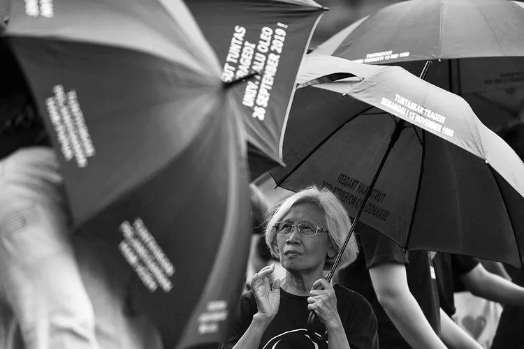 “Negara harus minta maaf, bukan malah bilang itu cuma rumor! Kita harus terus desak negara untuk bertanggung jawab. Karena jika penghilangan dilakukan agar tak ada yang mengingat, maka mengingat adalah bentuk perlawanan!” Perempuan berbaju hitam itu berseru lantang membacakan puisinya di depan massa aksi.
