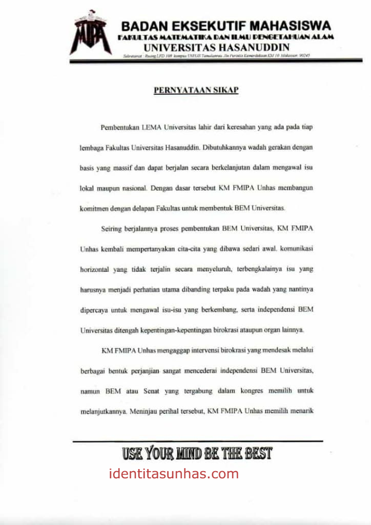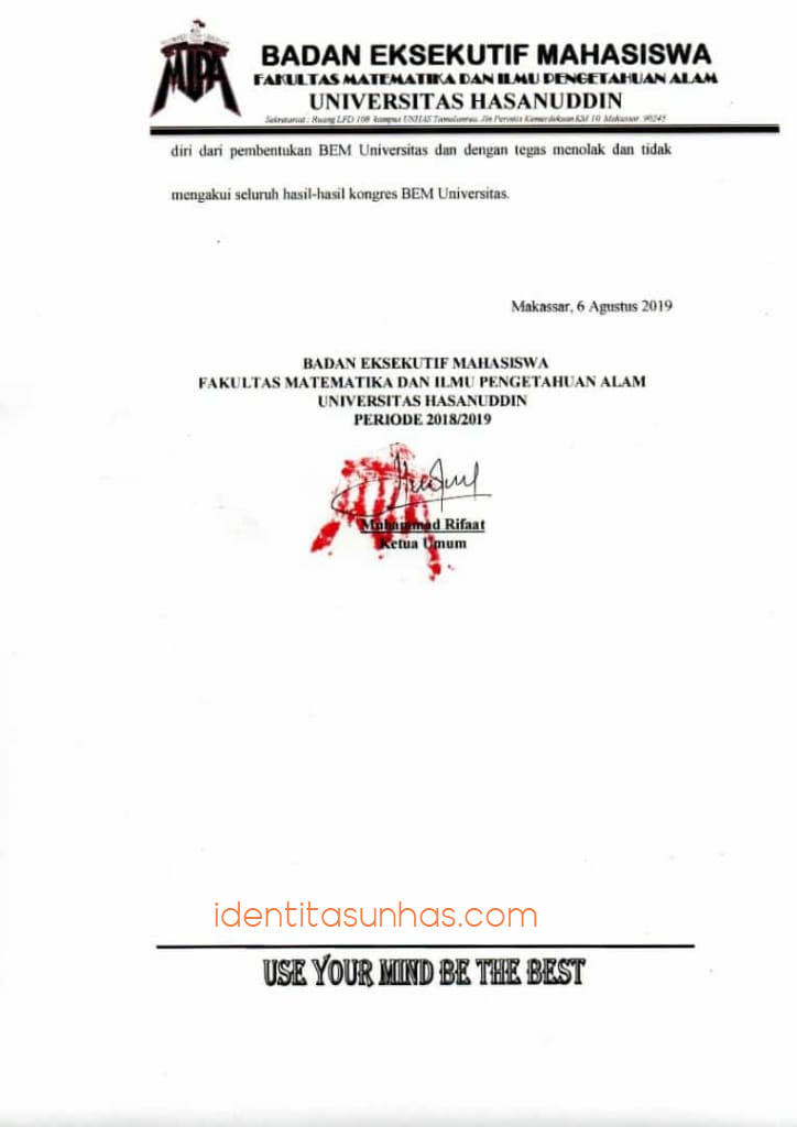 Namun, di tengah jalan, BEM FMIPA memutuskan menarik diri dari pembentukan BEM Unhas usai melalui beberapa pertimbangan. Dalam surat edaran BEM FMIPA Unhas yang ditandatangani Muhammad Rifaat, selaku Ketua Umum BEM FMIPA menyampaikan beberapa hal.