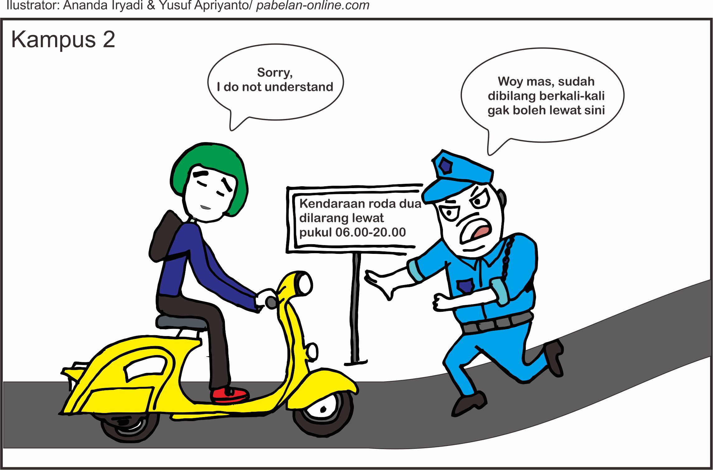 Mahasiswa Universitas Muhammadiyah Surakarta (UMS) pasti sudah tidak asing lagi dengan peraturan “roda dua dilarang melintas” di area kampus dua pada pukul enam pagi hingga delapan malam hari. Peraturan menggunakan bahasa Indonesia itu dicetak pada papan berlatar belakang merah dekat kantor satpam. Mahasiswa lokal yang melihat peraturan tersebut biasanya patuh dan melewati jalan lain. Namun bagaimana dengan mahasiswa asing?