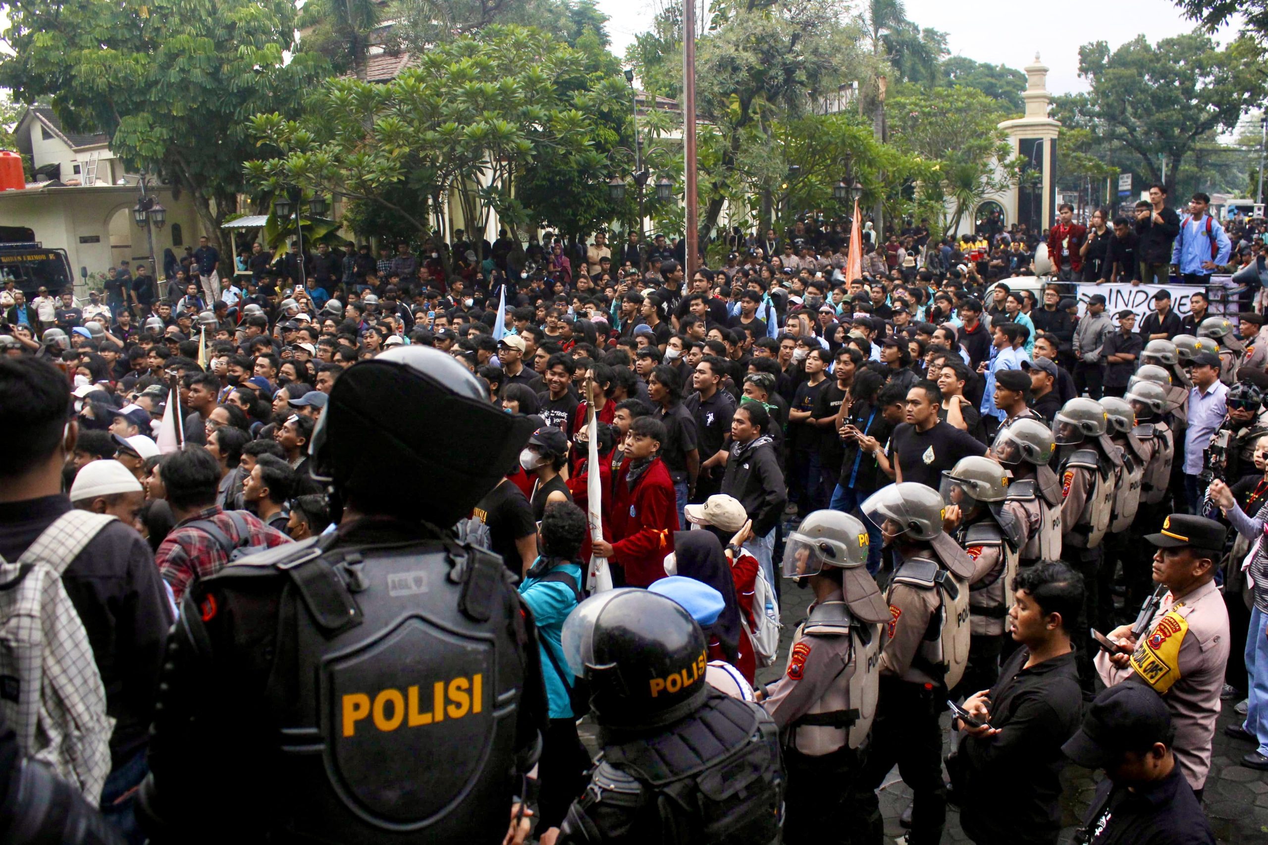 Massa — Demonstran Aksi Solo Raya bertajuk Indonesia gelap membanjiri pelataran. Massa aksi mendesak ingin memasuki Gedung DPRD Kota Surakarta, Rabu (19/2). Aqill Adhitya/Pabelan Online