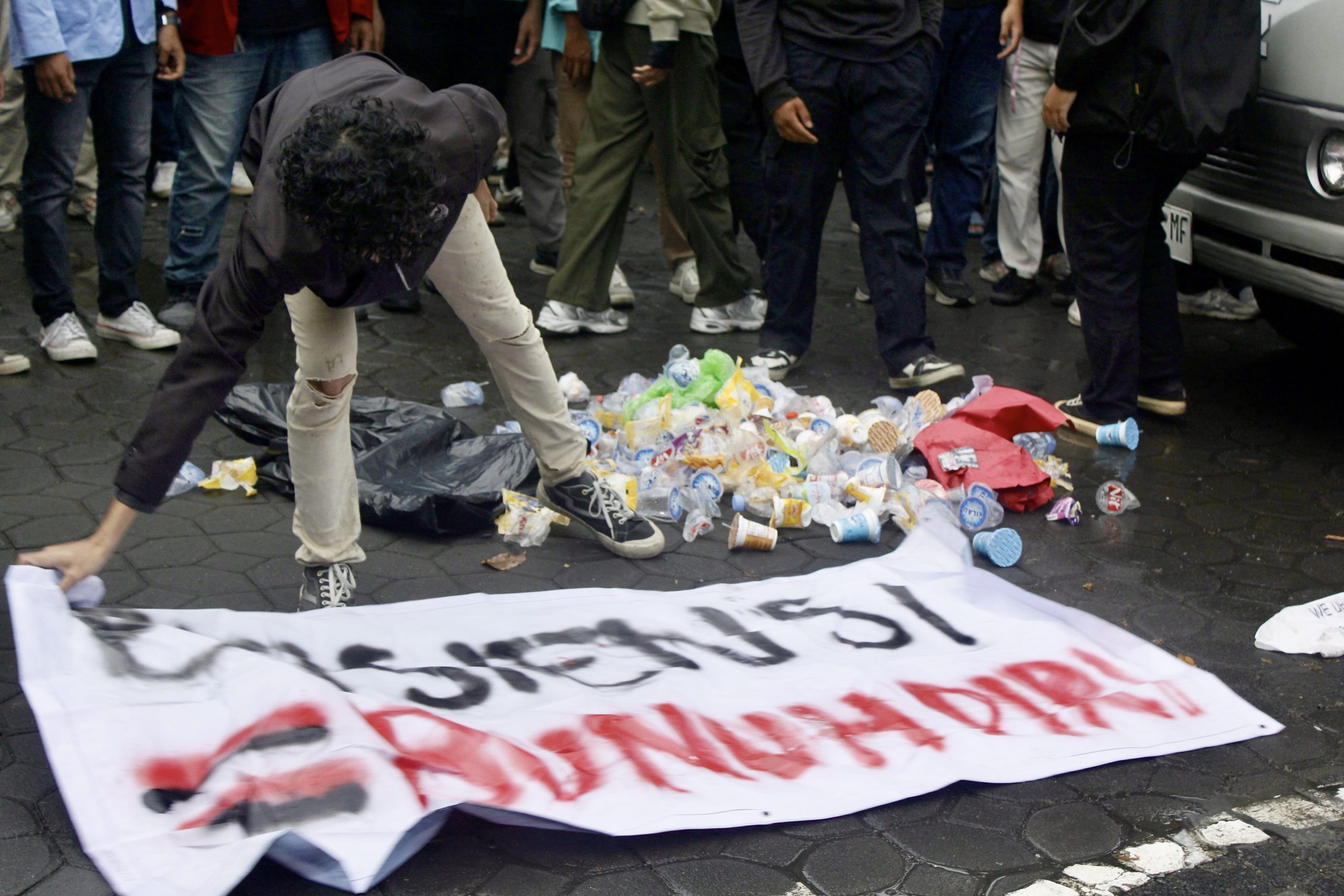 Simbolik — Massa Aksi Solo Raya membuang sampah di hadapan perwakilan dari pihak DPRD Kota Surakarta, sebagai salah satu bentuk kecaman untuk segera mewujudkan tuntutan massa, Rabu (19/2). Aqill Adhitya/Pabelan Online