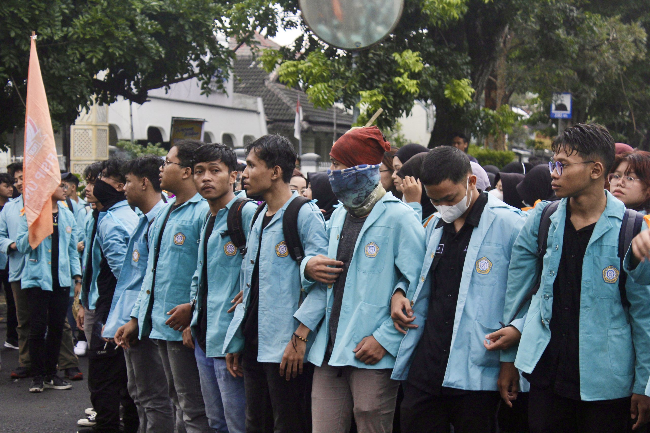 Bergandengan — Massa Aksi Solo Raya dari kalangan mahasiswa saling bergandengan tangan untuk menjaga kondusifitas dan keamanan. Massa aksi secara beriringan memasuki pelataran Gedung DPRD Kota Surakarta pada Rabu (19/2). Aqill Adhitya/Pabelan Online