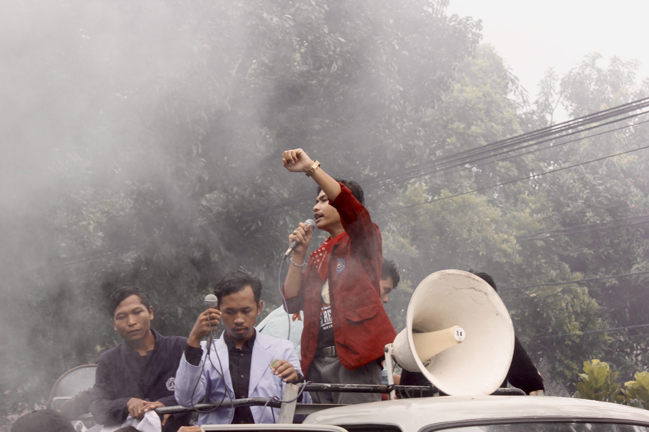 Kabut — Orator aksi Solo Raya melintasi asap pembakaran ban di tengah jalan. Mobil pick-up yang dinaiki oleh orator sedang memasuki pelataran Gedung DPRD Kota Surakarta, Rabu (19/2). Aqill Adhitya/Pabelan Online