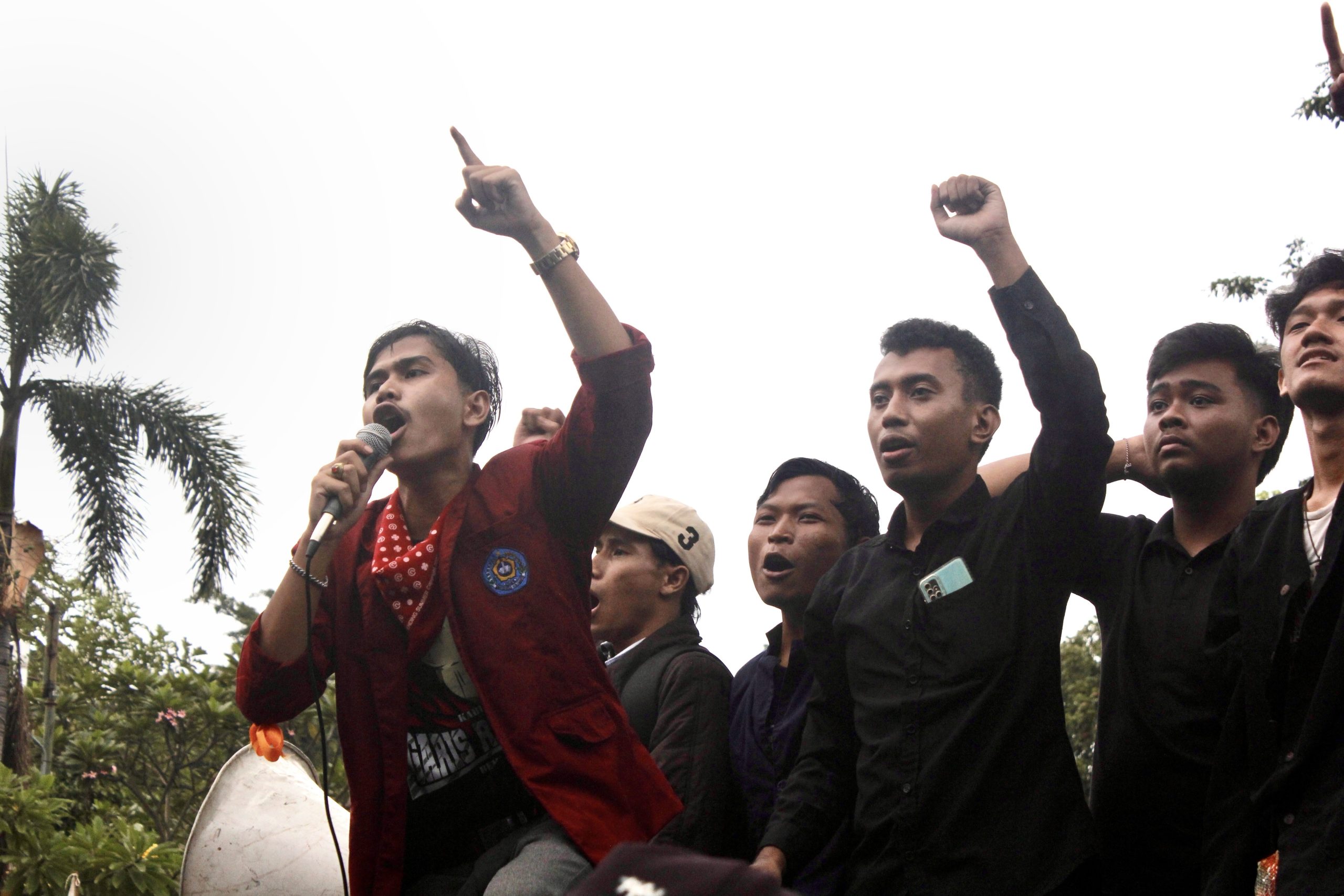 Berseru — Massa Aksi Solo Raya meneriakkan yel-yel yang diinisiasi oleh orator di atas mobil pick-up. Nyanyian dan teriakan memenuhi sepanjang pelataran Gedung DPRD Kota Surakarta pada Rabu (19/2). Aqill Adhitya/Pabelan Online