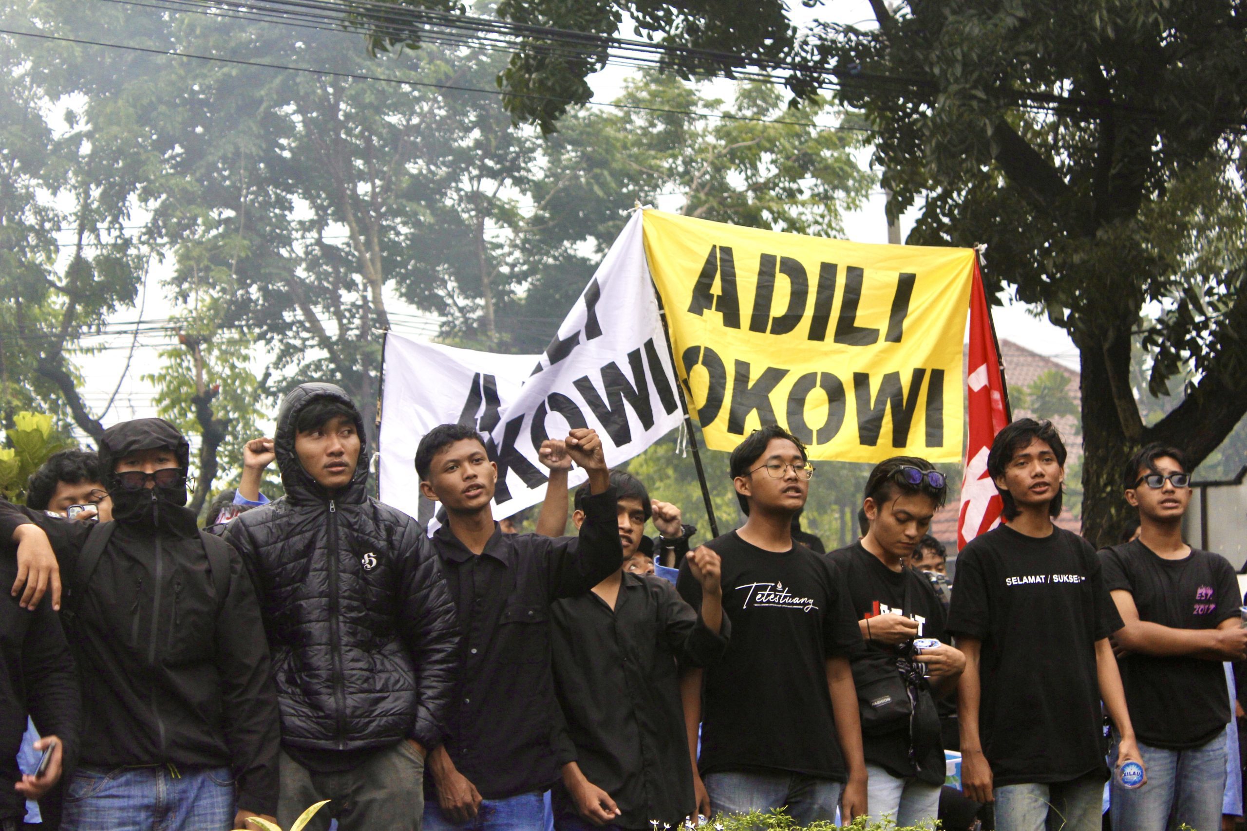 Spanduk — Massa aksi memperlihatkan salah satu isi tuntutan massa Aksi Solo Raya ialah ‘Adili Jokowi’. Spanduk itu dibentangkan di depan pintu gerbang Gedung DPRD Kota Surakarta, Rabu (19/2). Aqill Adhitya/Pabelan Online