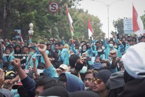 Penuh Semangat – Mahasiswa mengepalkan tangannya ke atas serta berteriak menyahut orasi dari orator dengan penuh semangat sebelum berlangsungnya long march dari Lapangan Blulukan menuju