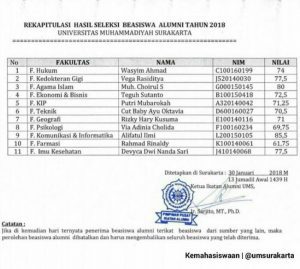 Bagi Alifatul Ilmi, di akhir penghujung Januari bisa jadi menjadi hari yang membahagiakan, bukan tanpa sebab melainkan dirinya keluar sebagai salah satu nama yang berhak memperoleh Beasiswa Alumni yang diselenggarakan Universitas Muhammadiyah Surakarta (UMS). Tak cukup dengan perolehan tersebut, skor nilai 85,5 berhasil ditorehkan sebagai nilai tertinggi dalam seleksi beasiswa tesebut.