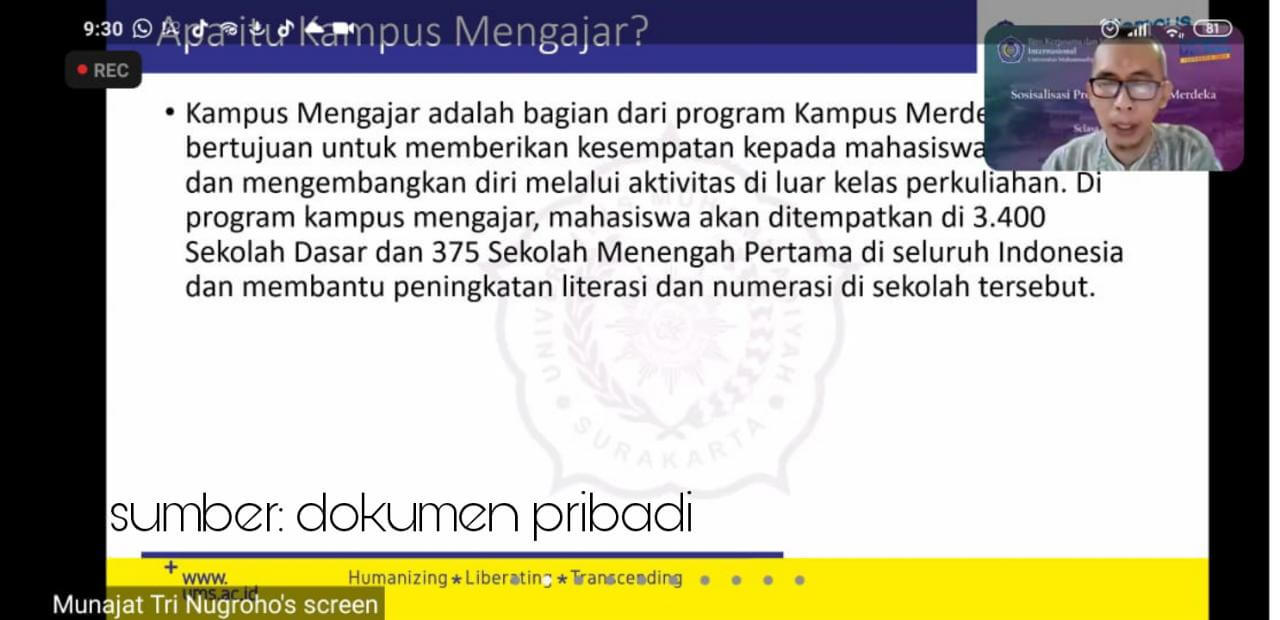 Munajat Tri Nugroho selaku pembicara dalam webinar, memberikan beberapa informasinya yang berkaitan dengan program Kampus Merdeka. Kampus Merdeka bertujuan agar mahasiswa memiliki kemampuan untuk menguasai berbagai ilmu yang berguna di dunia kerja kedepannya.