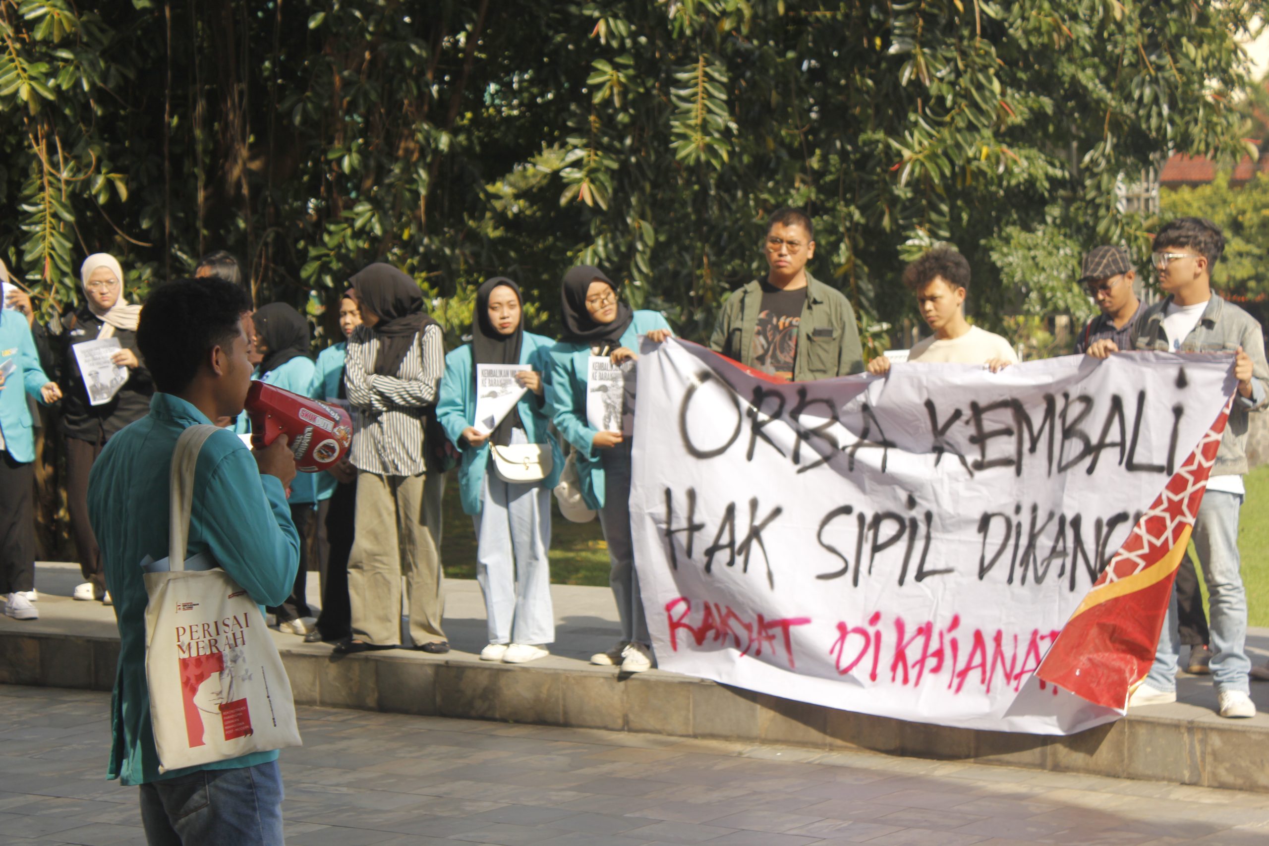 UMS, pabelan-online.com – Sejumlah mahasiswa Universitas Muhammadiyah Surakarta (UMS) mengadakan aksi mimbar bebas untuk mendesak rektorat menyatakan sikap universitas pada Kamis, 20 Maret 2025. Namun, tidak ada pihak rektorat yang turun untuk memberikan pernyataan sikap terhadap Revisi Undang-Undang (RUU) Tentara Nasional Indonesia (TNI) yang disahkan oleh Dewan Perwakilan Rakyat Republik Indonesia (DPR RI) meski mendapat banyak resistensi publik.